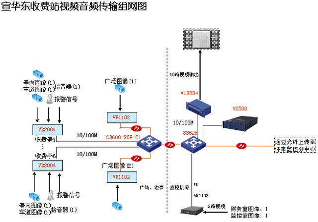 本工程中充分分析了各收费站的布设情况,采用广场和收费车道业务先在车道以太网交换机汇聚,再上传各站机房内的视频以太网交换机,并在本站完成所有图像的本站存储,所有图像上各站监视器墙(模拟视频),具有报警功能;同时,各收费站的以太网交换机通过光纤传输通道将所有收费126路数字化视频图像上传至怀来监控中心。