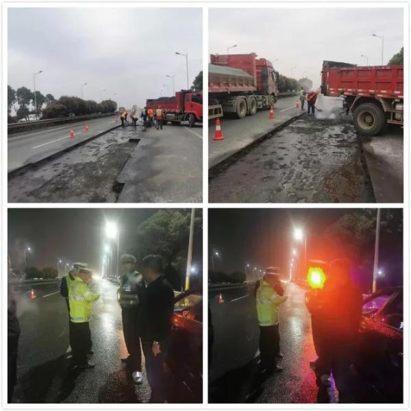 到达现场后,交警部门对路面隐患摆放锥桶,安排警力提醒过往车辆安全行车。并及时与天易经开区相关部门取得联系,对坑洼采取临时措施混凝土填充,并铺设钢板。