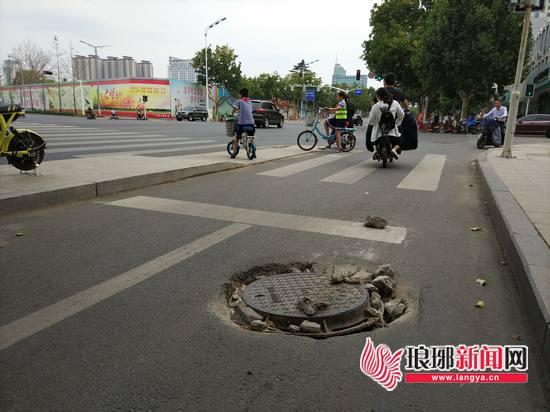 12日下午,记者来到现场看到,沂蒙路与开阳路交会处西北角的非机动车道内有一处井盖歪斜变形,井盖周边都是碎石块,不少石块跑到了平整的路面上,过往的电动车都急着躲闪,很危险。在旁边不远处的一个井盖也损坏了,甚至井盖的样子都看不到了,碎了一堆石块,有的碎石还露出了钢筋。